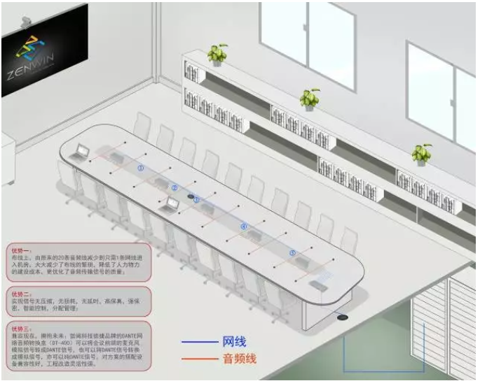 特別是在軍事機密之地,嚴肅、謹慎、高度戒備,在其會議室設備選擇上,除了要考慮到以上問題,還要求性能穩定,高效快捷,保密性強。經過多次篩選,軍區選用了DANTE智慧會議分布式解決方案:音頻部分用了CLOCKAUDIO的界面麥克風、名舞臺科技德捷品牌的DANTE網絡音頻轉換盒(DT-400 )、8路數字自動混音器、思美處理器、銳豐百靈達音箱,視頻部分用了哲聞科技柏邇品牌的網絡傳輸器(TP-402P HDBast),音視頻相結合,共同搭建了一個安全、高效、兼容傳統與DANTE、易于擴展的新型會議系統。