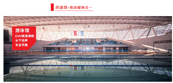 游泳館除了設有標準競賽游泳池、訓練池外,還設有各種水療休閑設施、部分水上用品商業以及兒童娛樂池和滑道等,供普通市民休閑娛樂使用。在游泳館頂部,業主同樣選用了白色EVH系列揚聲器,在美觀度和品質方面和場館高度統一。