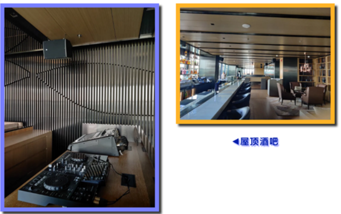 27樓屋頂酒吧Flair,分室內室外兩部分,配置DJ打碟機,主擴聲由EV SM系列全頻同軸+15寸超低音組成,室外視野極佳,就坐于池水邊。身邊綠植叢中隱藏的EV 8寸蘑菇音箱同步播放室內音樂,品美酒賞夜景甚為愜意,開業即成為高新區的一個新的網紅打卡地。