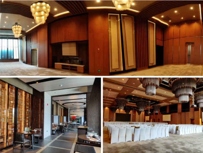 主題為“絲綢之路”的小宴會廳位于酒店一樓,可分合式的宴會廳,能夠根據使用需求任意組合布置,滿足餐飲、會議、宴會等多種場景。現在的擴聲系統采用EV 8寸吸頂,由AEV的DPA系列內置DSP數字功放以定阻模式驅動。投影采用EPSON高清激光投影機,根據安裝位置更換的不同的鏡頭,達到投影的最佳效果。
