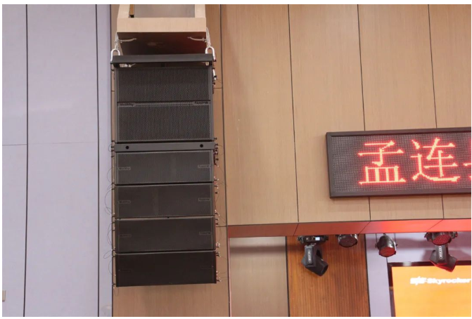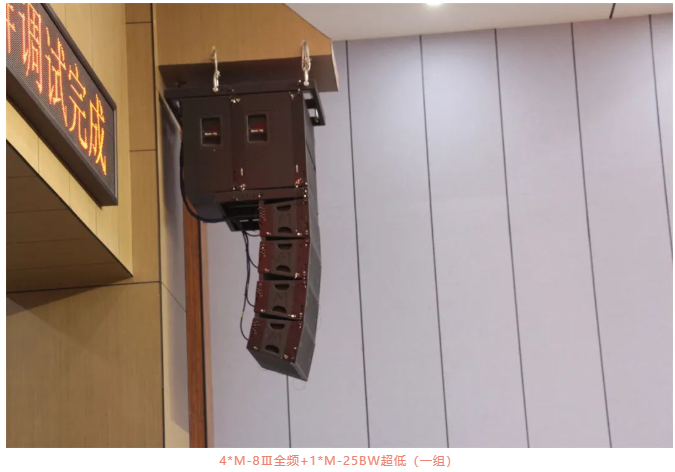 根據報告廳的建筑和聲場環境,首先在主擴聲系統上,使用了8只M-8Ⅲ線陣全頻+2只M-25BW線陣超低,平分為兩組,組合吊掛安裝于舞臺兩邊,調整最佳的高度和角度打向觀眾區域。M系列線陣系統能夠形成一個連續、等相位的線性聲源,聲音均勻覆蓋前排及后排觀眾區,同時超重低頻能量十足,演出活動也妥妥拿捏。