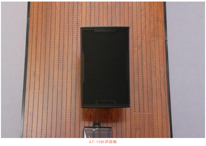 然后,由4只AT-10作為補聲音箱,壁掛在觀眾區兩邊墻面,每邊兩只,使得整個報告廳的聲場更加均勻,也使得語言清晰度進一步提升。