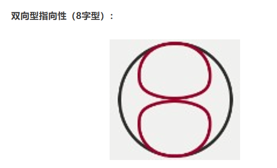 上圖顯示的是極性模式雙向型指向性(8字型),捕捉麥克風(fēng)正面和背面的聲音,意味著對前后區(qū)域的聲音十分靈敏,而對兩側(cè)的聲音幾乎屏蔽。通常是鋁帶或大型振膜話筒所持有的“特技”。也是很多立體聲以及環(huán)繞立體聲錄音制式的必備技能。