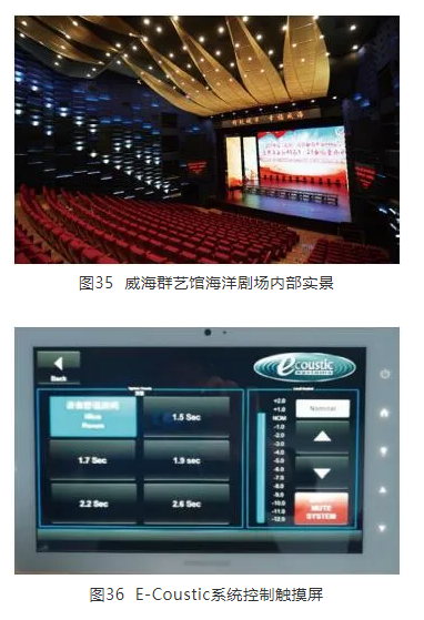 如前所述,E-Coustic系統(tǒng)基于世界最著名的專業(yè)混響器研發(fā)生產企業(yè)Lexicon而來,其獨到的混響算法為這種嵌入式系統(tǒng)提供了一個非常好的再生聽感,同時E-Coustic先進的時變技術,也很好地保證了系統(tǒng)的穩(wěn)定性。本系統(tǒng)中,傳聲器與揚聲器的距離很近,但很好地抑制了聲反饋和聲染色的問題。同時系統(tǒng)使用較少的傳聲器-揚聲器通路,即能達到改變聲學環(huán)境的效果,也很大程度的降低了施工難度,這也是嵌入式系統(tǒng)的固有優(yōu)勢之一。威海市群藝館海洋劇場內部實景及E-Coustic控制觸摸屏分別如圖35和圖36所示。