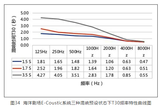 本項目總共進行了兩次調試,第一次調試完成后,客戶在使用過程中感覺混響時間不足以滿足廳堂所有的應用場景,故又根據(jù)客戶的需求進行了第二次調試,增長了混響時間。除了廳堂自身的固有聲學條件外,經歷了兩次調試的E-Coustic系統(tǒng)共設置了10個混響時間預設模式,分別為1.5 s、1.7 s、1.9 s、2.2 s、2.6 s、2.9 s、3.2 s、3.5 s、4 s和6 s,同時,還設置了一個對廳堂本身聲學問題進行一定程度修復的語音舒適模式。現(xiàn)場調試完成后選取了1.5 s、1.7 s及3.5 s預設進行了實地測量,T30的測量結果如圖34所示。此外,系統(tǒng)本身對初始時間間隙、早期反射聲、混響能量等聲學參數(shù)均可單獨調節(jié),這也極大地豐富了系統(tǒng)的綜合調控能力,使整個聲學空間的真實感和內部參數(shù)間的適配度得以有效提升。