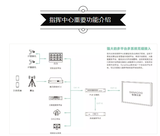 綜合指揮中心是一個集預案、視頻、圖片、語音、地理位置等信息為一體,以信息網絡為基礎,各系統有機互動為特點的城市信息化基礎設施。通過集成的視頻監控系統、GIS信息系統、網絡通訊系統和應急聯動系統將公安、消防、衛生、交通等應急指揮與調度集成在一個管理體系中,通過共享指揮平臺和信息平臺,實現集中接警、及時研判、快速響應、統一指揮和聯合行動。