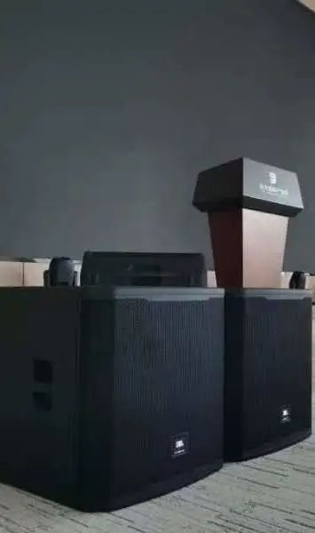 廳內主擴采用8只美國JBL Professional SRX910LA新一代巡演級線陣列揚聲器,搭配新一代智能有源超低PRX918XLFW,舞臺返送采用PRX912雙分頻揚聲器,共同打造極致的聲音體驗。PHONIC ACUMEN 6A高保真監聽音箱提供高質量的音頻監控。