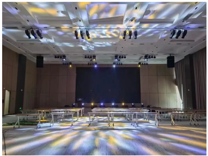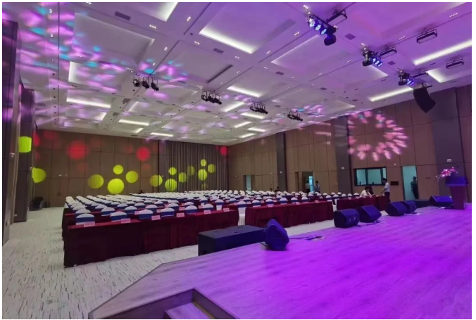 燈光系統選用DLW筑夢燈光 DLW 400 BSW三合一電腦燈、DLW 354C4 PAR LED染色燈、DREAM 200PL IMAG定焦成像燈、DREAM 200 WSL LED成像燈,并與音響系統聯動,共同打造集聲光電為一體的多功能宴會廳。