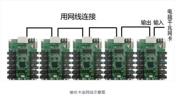 我們這里每張卡帶三列模組,共36塊板,這樣每三列裝一塊卡,從就近的電源上取5V給卡供上電,注意正負(fù)極,然后用網(wǎng)線(xiàn)把5張卡連起來(lái),靠電源接頭的網(wǎng)口是輸入口,右邊是第1塊卡,也是頭卡,輸入接的是電腦的千兆網(wǎng)卡,然后輸出網(wǎng)口接的是第2塊卡的輸入口,第2塊卡的輸出口接的是第3塊卡的輸入口,這樣一直到最后一張卡,第5張卡,輸入接第4張卡的輸出。輸出口為空。
