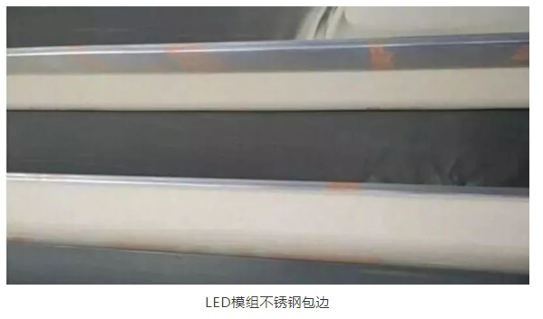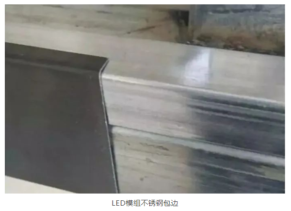 裝模組之前要用不銹鋼包邊,這僅僅是為了好看,也是安裝單位要求的,專(zhuān)門(mén)找來(lái)了做不銹鋼的師傅來(lái)量了尺寸,估算了下他量完鋼結(jié)構(gòu)后加大了5mm吧,為方便能好安裝又能卡死不銹鋼包邊。這里因?yàn)槠聊怀叽绮淮螅覀兲崆鞍惭b的不銹鋼包邊,有時(shí)也可以在屏幕安裝完后再安裝不銹鋼包邊,但是要注意的就是底部第一排水平一定要做好。