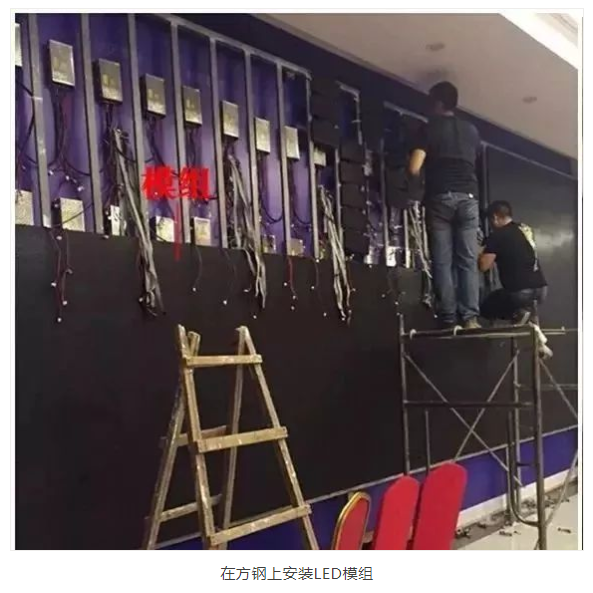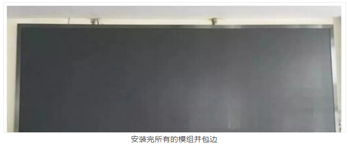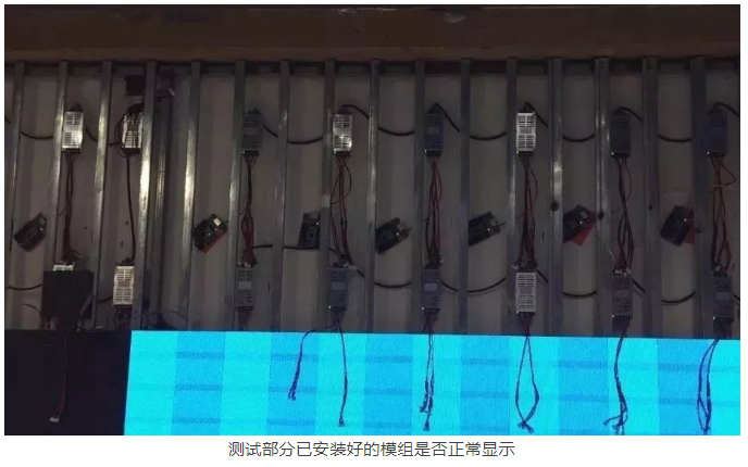 扣好不銹鋼邊后就能開(kāi)紿上模組了。模組建議從下往上裝,從中間往兩邊開(kāi)始安裝。這樣的安裝方式有很多爭(zhēng)議,從底部安裝主要是為了使水平和垂直都能在正常控制范圍內(nèi),特別是屏幕的面積大了以后,更加容易失控,特別是小間距的要求超高,有點(diǎn)縫隙沒(méi)有達(dá)到要求,都需要做精細(xì)的調(diào)整。