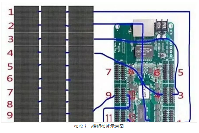 按照?qǐng)D紙安裝模組自帶的排線(xiàn),短排線(xiàn)只適合模組與模組的連接,從控制卡到模組的長(zhǎng)排線(xiàn)是要安裝線(xiàn)序長(zhǎng)短安裝的,最上面和最下面用的排線(xiàn)最長(zhǎng),我們這里大概是1米半長(zhǎng)。