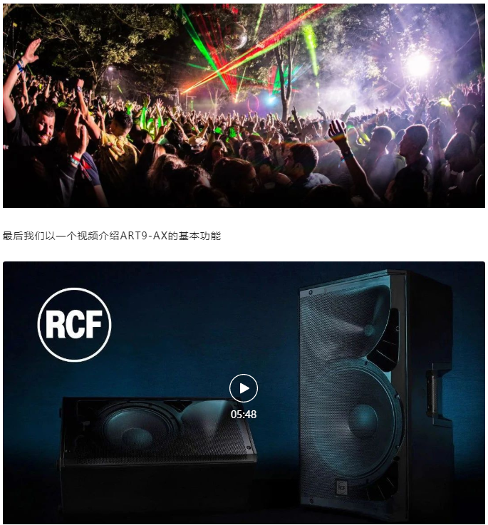 RCF最新推出了全新的ART9-AX系列,ART9-AX是一款具有48V麥克風前置放大器和線路輸入、內置6通道數字調音臺和高級DSP、Bluetooth®(藍牙)流媒體和控制功能的兩分頻揚聲器。適用于任何音頻應用的頂級解決方案。