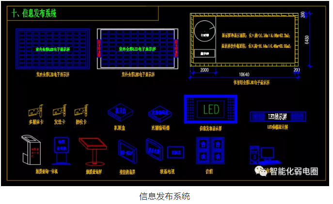 信息發(fā)布系統(tǒng)弱電設(shè)計(jì)圖標(biāo)主要有LED屏,LCD屏,發(fā)送卡,接收卡,音箱等組成。