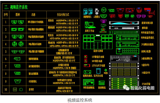 視頻監(jiān)控系統(tǒng)是智能化l弱電系統(tǒng)最常用的系統(tǒng)之一,整套系統(tǒng)包括前端攝像頭,線纜,交換機(jī),存儲(chǔ),解碼,大屏等設(shè)備組成,視頻監(jiān)控系統(tǒng)涉及到的弱電設(shè)計(jì)圖標(biāo)主要有半球攝像機(jī),球機(jī),槍機(jī),全景攝像頭,高考拋物攝頭,NVR,IPSAN,矩陣,流媒體服務(wù)器,解碼器,電腦終端,開關(guān)電源等等。