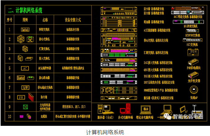 在弱電工程師勘測(cè)現(xiàn)場(chǎng)結(jié)束后,需要在原先設(shè)計(jì)院的CAD圖紙重新進(jìn)行深化設(shè)計(jì),圖紙上會(huì)修改設(shè)備類型,安裝方式,線纜走向及設(shè)備圖標(biāo)。下面重點(diǎn)介紹弱電行業(yè)常用的智能化弱電設(shè)計(jì)圖標(biāo)。