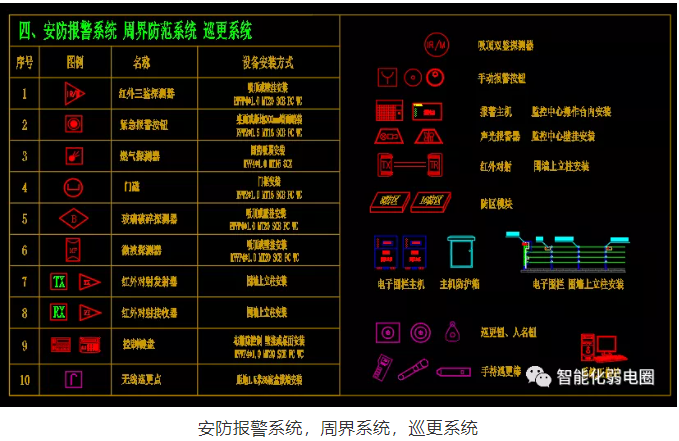 安防報(bào)警、周界防范、巡更系統(tǒng)弱電設(shè)計(jì)圖標(biāo)主要有紅外探測(cè)器,緊急報(bào)警按鈕,燃?xì)馓綔y(cè)器,門磁,紅外對(duì)射,無線巡更點(diǎn)等等。