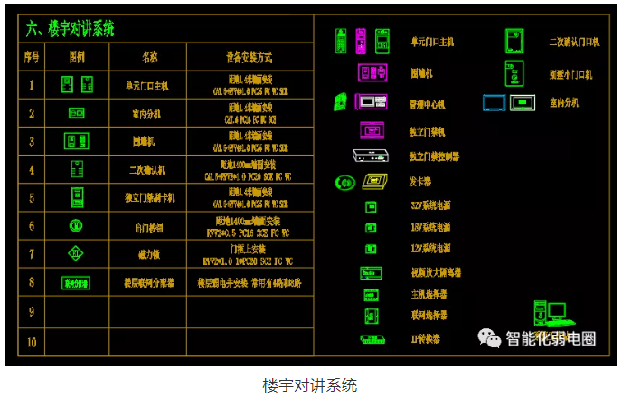 樓宇對(duì)講系統(tǒng)弱電設(shè)計(jì)圖標(biāo)主要有單元門口主機(jī)、室內(nèi)分機(jī)、圍墻機(jī)、出門按鈕、磁力鎖,管理中心機(jī),門禁控制器等組成。