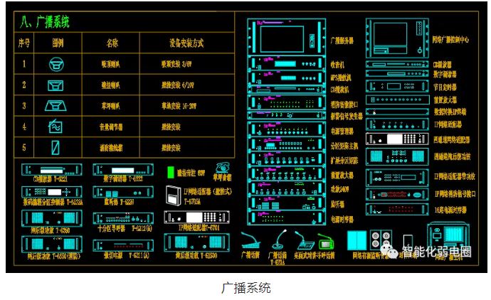 廣播系統(tǒng)弱電設(shè)計(jì)圖標(biāo)主要包括吸頂喇叭,網(wǎng)絡(luò)廣播服務(wù)器,節(jié)目定時(shí)器,功放,音柱等組成。