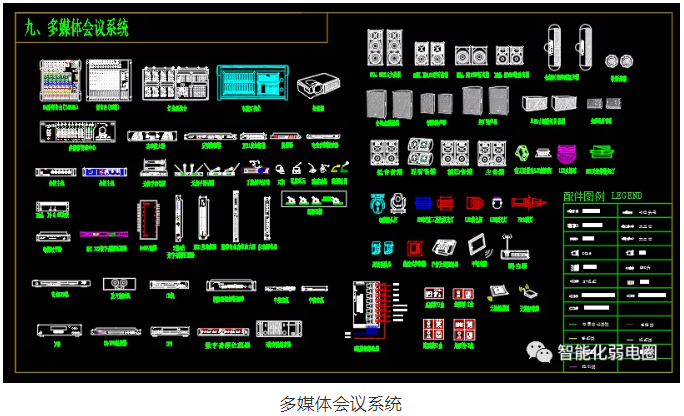 多媒體會(huì)議系統(tǒng)弱電設(shè)計(jì)圖標(biāo)主要調(diào)音臺(tái),燈光調(diào)光臺(tái),投影機(jī),功率放大器,專業(yè)音頻播放器,會(huì)議主機(jī),無線手持話筒等組成。