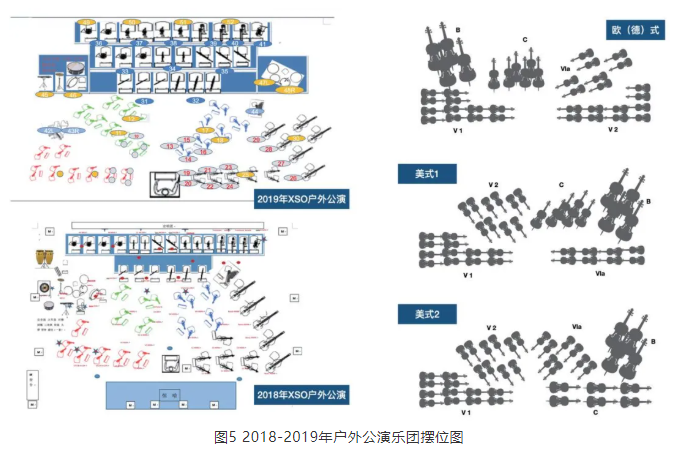 還有一種比較常見的擺位,在1777年由德國作曲家阿貝福格勒提出,19世紀下半葉被廣泛采用,通常稱之為歐式(德式)擺位。這種擺位關系下,有利于首席小提和首席大提、大提和貝斯的交流,特別是在合奏樂段的部分。在該演出中,一提和二提兩組相對而坐,會有一提二提一問一答的樂段,使聲像形成立體效果,且由于二提的f音孔朝向舞臺內側與f音孔朝向觀眾的一提音色也有著微妙并明顯的差異。任何一種擺位都無法十全十美,直到現在對于采用哪種擺位方式,音樂家們還多有爭執。一種觀點認為,德式的擺位需要得到側墻面的支持,對于音樂廳建聲環境要求較高;還有一種觀點認為,美式的擺位雖然能夠更加容易分辨不同的樂器組,但會使樂隊右側低頻較重,導致空間上的不平衡。一場音樂會同時演奏橫跨不同時期的曲目,這些曲目創作和演奏時的樂團擺位都不盡相同,例如上文提到的一提和二提一問一答的效果很容易湮沒在其他擺位中相鄰的聲部里。但現場隨著曲目的要求變換樂隊擺位并不現實,采用電聲系統的調整可在一定程度上彌補改善擺位帶來的缺點,通過調節EQ、混響、PAN等手段能夠實現各個聲部相對定位關系的改變,從而更好地表現不同作品。例如上文提到的一提和二提一問一答效果的實現(當然要注意點補傳聲器和主傳聲器的關系調整,也需要在效果和回授前有效增益之間找到平衡),以及特定擺位帶來的空間不平衡,再加之合理地使用如DearVR MICRO等融入HRTF( Head-Related Transfer Function )原理的空間模擬插件,從而“創造”出不同的空間體驗。根據美式擺位,合唱團一般會由女聲站在男聲前面,按照從左到右女高音-女中音-男高音-男低音來獲得平衡。對于合唱團來說,音色統一和聲音足夠清晰是比較重要的。合唱由多個非相干聲源組成,雖然團員按照站位排開,但在空間上對某一個團員甚至一個聲部進行分辨都是困難的。在音樂廳的舞臺上,由于側墻及返聲板的反射,合唱給人以包圍感、融合感。但在戶外的環境里沒有了這些反射聲,合唱的音效就要通過拾音、混音實現。合唱團的拾音一般只是3~4支傳聲器,拾音距離按照3∶1規則分布,以減少相位抵消。通常情況下,離傳聲器較近,尤其在傳聲器軸線的合唱演員聲音會較為突出,使得整個合唱在整個系統里的定位固定,群感融合度不夠。通過使用壓縮器修整冒尖的聲音,通過使用效果器來模擬早期反射聲,以提高整體的融合度。室外的現場擴聲體驗與音樂廳內“沉浸”的聽聞感受有著從底層邏輯上的不同。音樂廳內的現場體驗決定于音樂廳的聲學環境及聽音位置。室外現場擴聲體驗決定于拾音、混音技巧以及擴聲系統的設計,通過技術手段實現聲場的重構、再構,達到聽聞的一致性。隨著電聲技術發展,將給現場聽聞帶來更豐富、更舒適的體驗,亦如當年技術發展(動力學、材料學,甚至是建筑技術)對于歐洲樂器制作、演奏、作曲技法乃至音樂風格產生深遠而持久的影響。2.3.2 拾音的設計思路由于調音臺輸入通道的限制,沒有對每一件樂器進行單獨拾音,采用對聲部首席及前檔、對聲部整體拾取的方案,見圖5;除去演出流程相關無線傳聲器、視頻等,樂團合唱團以及獨奏共使用72個通道,見表1。由DPA4006C作為主傳聲器,SCHOEPS MK2s用于側展,相當于與主傳聲器形成了一個大的Decca Tree拾音制式。主傳聲器負責整個樂隊的基準平衡,側展傳聲器用于構建樂團的空間效果。