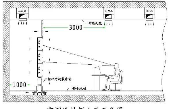 2) 整個大廳的燈按平行于屏幕方向分組進行控制,不要選用較強光的光源,燈光的布置原則是:使工作區有足夠燈光強度,但對屏幕又不會產生明顯的影響。