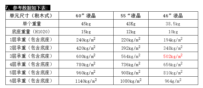 注意:用戶需根據大屏幕顯示系統設備的總重量,看現場系統設備安裝區的樓層承重是否能滿足設備的承重要求,如不能滿足要求,必須請專業公司對樓層承重進行加固處理。
