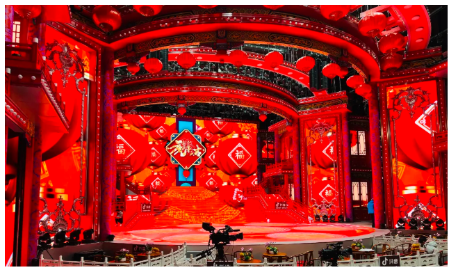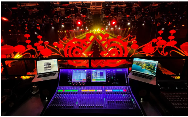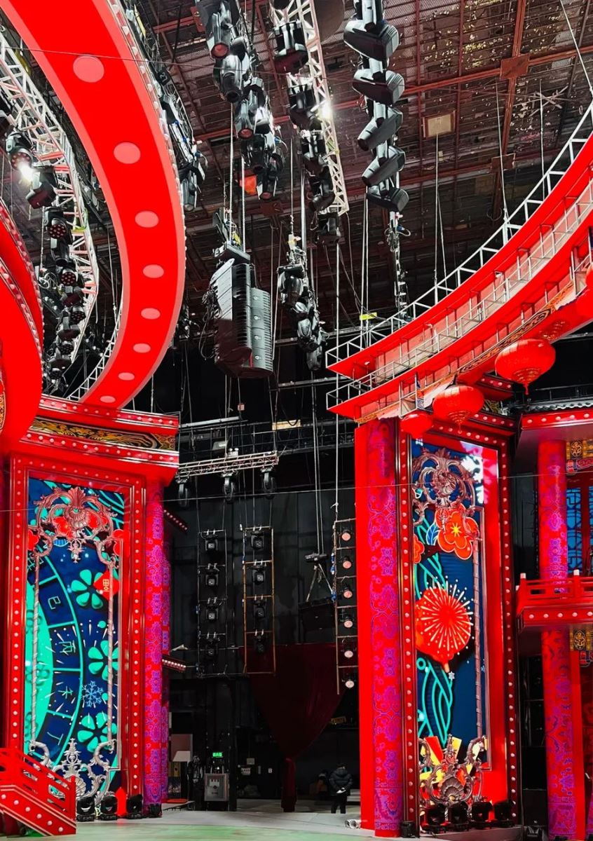 此次遼視春晚舞美設(shè)計(jì)較為復(fù)雜,舞臺(tái)頂部使用了喜慶的中式風(fēng)格,有中式建筑的頂部橫梁,還懸掛有多只大紅燈籠。為滿足拍攝的美觀需求,曾多次調(diào)整主擴(kuò)系統(tǒng)的吊裝高度和位置,最終主系統(tǒng)被吊掛在舞臺(tái)兩側(cè)上空10.5米的高度,隱藏在中式風(fēng)格弧型橫梁的后部,毫無(wú)違和感。
