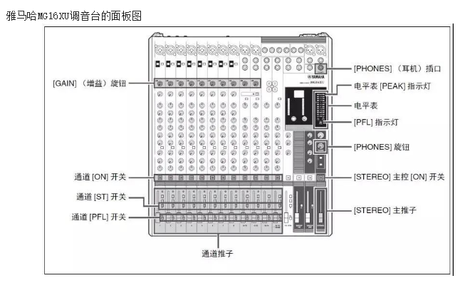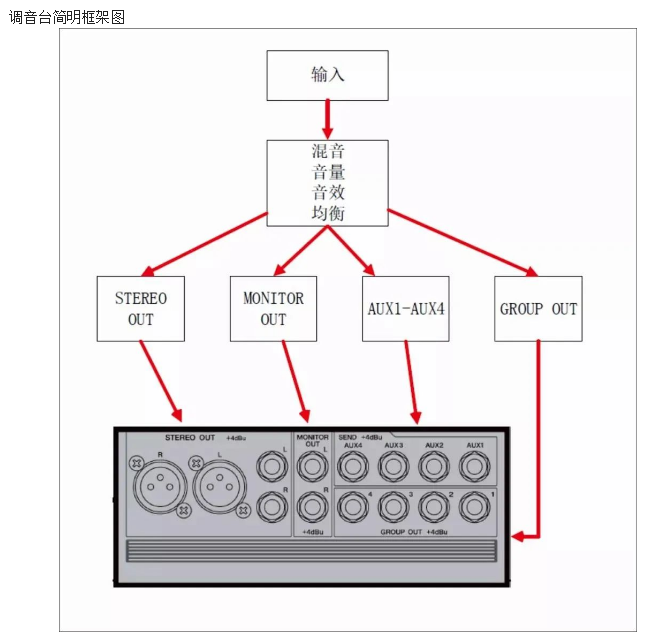 調音臺的主要功能是:把各種輸入的音頻信號在調音臺內部進行混音和細調,然后在輸出接口輸出經過調整的音頻信號。
