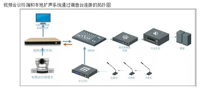 在連接視頻會議和本地話筒的時候,要把視頻會議終端的音頻輸出口連接到調音臺上去。然后本地話筒的信號經過調音臺后,通過編組輸出到編組接口,然后再把調音臺的編組輸出,連接到視頻會議終端的音頻輸入接口?;蛘哂袝r候為了消除回聲,要把話筒的編組輸出到數字音頻處理器,然后從音頻處理器再連接到視頻會議終端的音頻輸入接口。