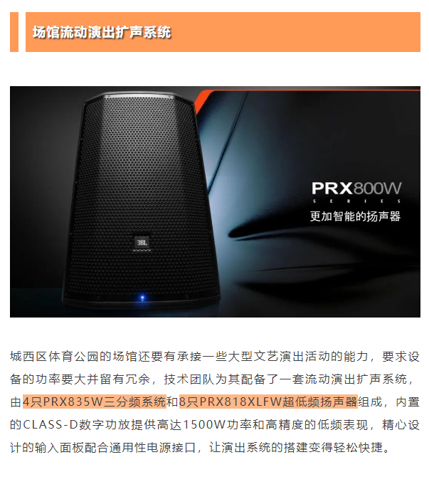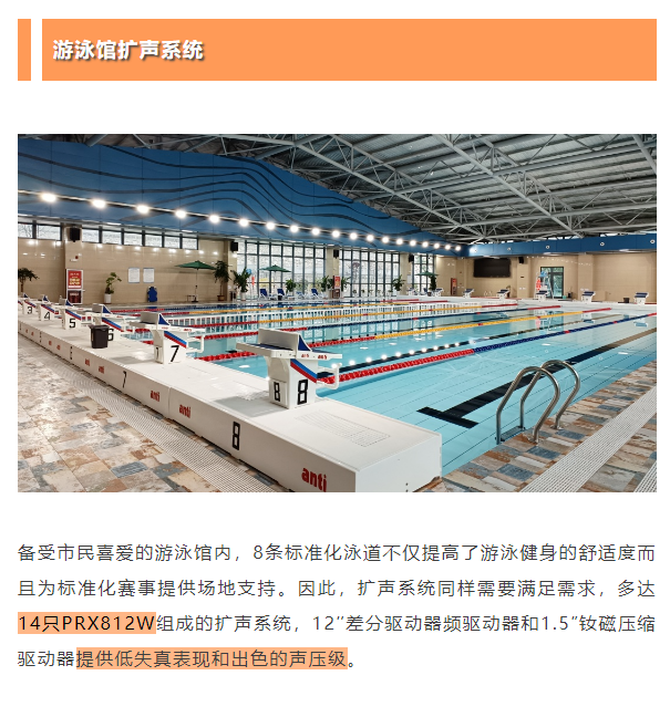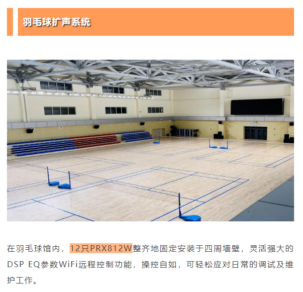 此次為城西區(qū)體育公園籃球館、羽毛球館和游泳館打造的擴(kuò)聲系統(tǒng)全部采用美國JBL PRX800智能有源揚聲器系統(tǒng),更智能、更響亮、更穩(wěn)定的技術(shù)優(yōu)勢為市民的日常健身氛圍和重大賽事的舉辦提供高質(zhì)量支持。