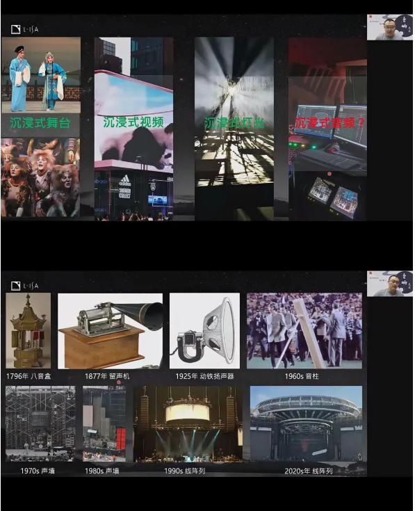 通過摩托車環(huán)繞的音效視頻,介紹了主講嘉賓與其團隊如何通過3D科技制造環(huán)繞音效,帶給觀眾沉浸式的聽覺體驗。并且講解追蹤器與拾音話筒如何結合實現(xiàn)實景與藝術結合。音響與舞臺、燈光、布景的融合是未來演出的一種趨勢,能帶給觀眾更真切的體會。