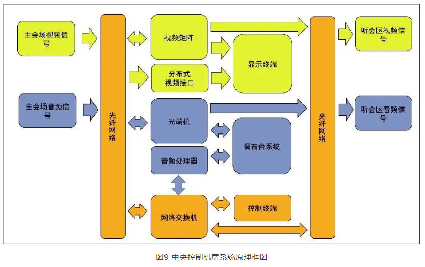 中央控制機房與各聽會區域之間采用光纖傳輸,以音視頻網絡信號方式為主,同時也預留一定數量光纖通路(可后期采購音頻光端機、視頻光收發設備實現點對點方式傳輸)。對于重要的會議活動,采用點對點的方式傳輸仍是需要的。