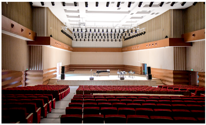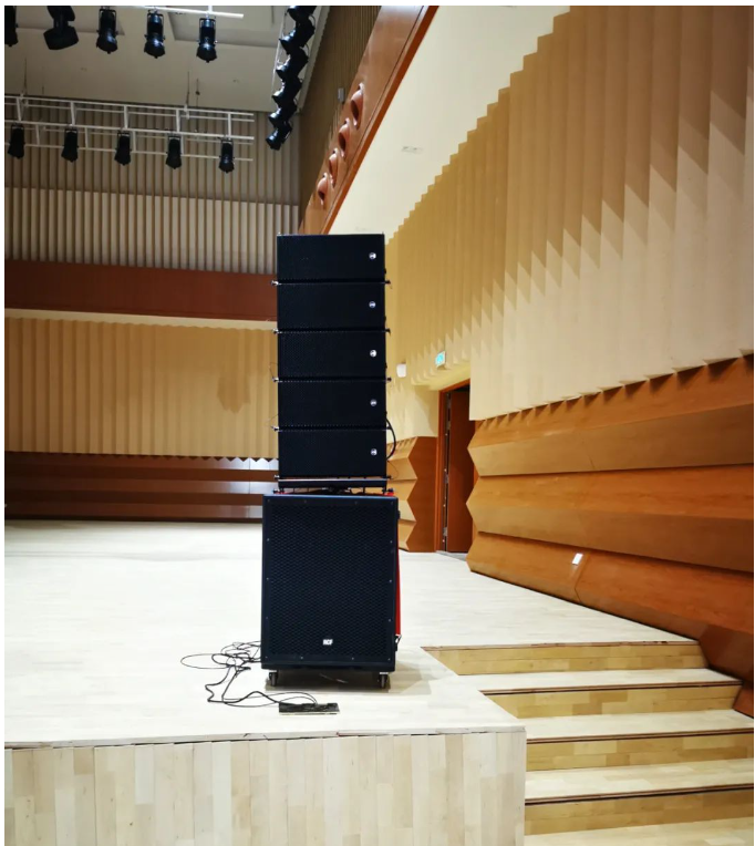 音樂廳音響系統采自意大利進口品牌RCF音響,HDL有源線陣列系統,舞臺返聽為兩組ART300有源系列音箱。