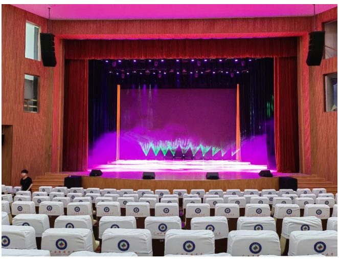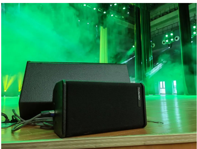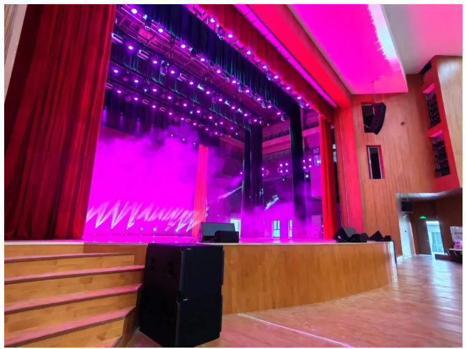 其中主擴聲系統(tǒng)采用德國TWAUDiO VERA20i 雙10寸線陣列揚聲器12只以左右兩組吊掛在舞臺上方,搭配4只 VERA32心形指向超低音揚聲器。