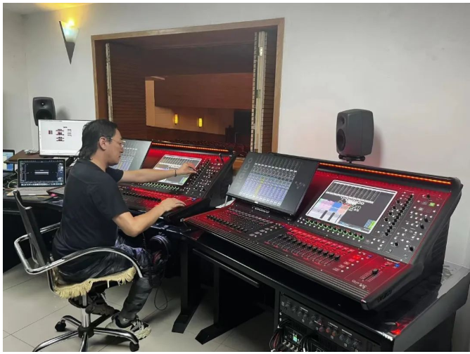 主擴使用L-Acoustics A15i(A15i Foucs、A15i Wide)。A15i擁有Panflex技術,可在現場很直觀地調節好音箱的聲輻射方向,保證觀眾席各個區域內都可獲得較為均勻的直達聲,精準的角度投射有利于實現聲場的全覆蓋;低頻音箱使用KS21i,擴展低頻下限。 主擴系統明裝線陣列吊掛置舞臺上方,明裝吊掛使聲音不受阻擋,能大幅度減少對聲能的損失并提高清晰度。且A15i外觀干凈整潔符合場地的審美需求,是聽覺效果和視覺效果的最佳解決方案。 補聲和返送系統選擇X12多功能同軸系統揚聲器。擁有90°x60°橢形指向性,可根據現場聽音需求進行調整,確保獲得最真實的聽感。 臺唇比較靠近觀眾區域,選擇小巧的5XT揚聲器補充前排觀眾的聲音能量,有效避免對觀眾視覺體驗造成影響。另外,臺唇高度的設置也十分合理,恰好高于桌子避免被遮擋,使前區的聽眾獲得更多直達聲。 調音臺使用兩張DiGiCo Quantum 225互為鏡像備份,兩張同型號、同版本的調音臺之間進行實時的數據同步,一個人可同時操作兩個調音臺,方便快捷。主備設備還能隨時切換,穩定性大幅提高,全面保障演出過程中音頻信號穩定傳輸。 升級改造后的效果受到大家的一致好評,沉浸式的聽音環境有效提高觀眾的感官體驗,震撼的效果深深感染和陶醉著在場的每一位觀眾,引發強烈的情感共鳴。