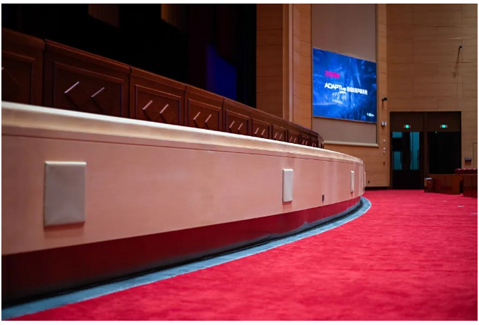 舞臺臺唇固定安裝了多只CMI5,為觀眾席前排座席補充中高頻響應。CMI5是采用同軸設計的超緊湊兩分頻揚聲器,可以提供優秀的指向性控制和均勻一致的聽音體驗。針對安裝位置過高,而造成的兩側主擴揚聲器覆蓋不足的情況,在左右八字墻大屏下方位置,固定暗藏了MKD896點聲源揚聲器予以補充。